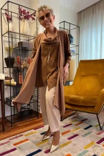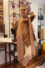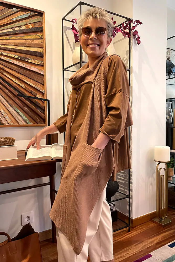 Cuello en tejido viscosa en color tostado. El tejido hace un poco de relieve. Estructura de picos en la parte delantera. Tiene bolsillos.