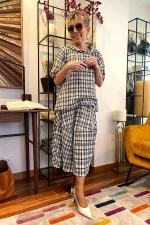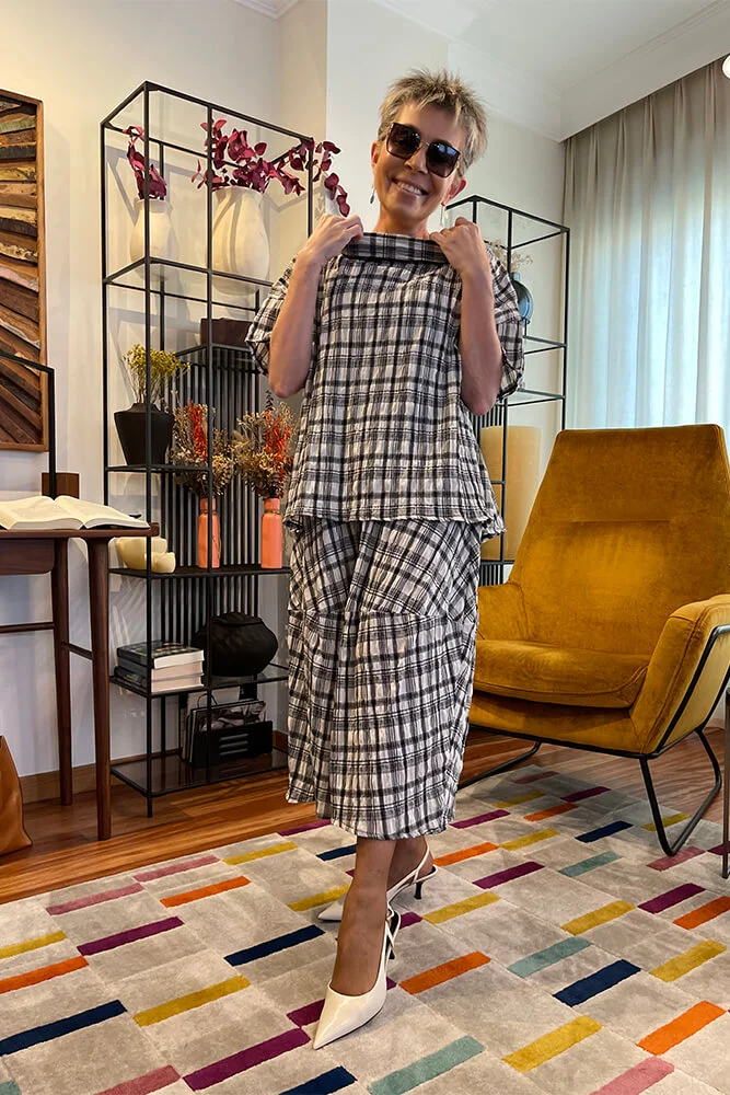 Falda con estampado de cuadros en tejido efecto arrugado. Largo midi. Corte en el muslo con efecto ligeramente globo.