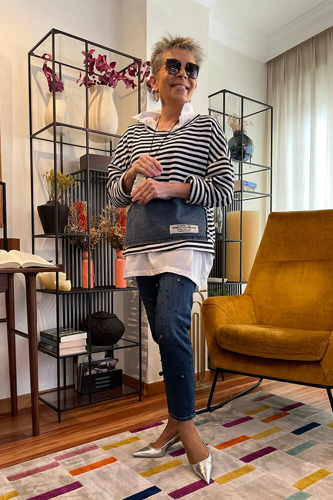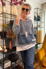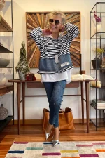 Top de algodón con estampado de rayas en blanco y azul marino. Detalle de aplicación denim en el delantero. Escote redondeado. Manga larga.