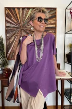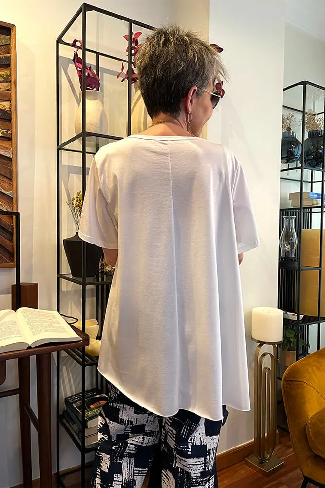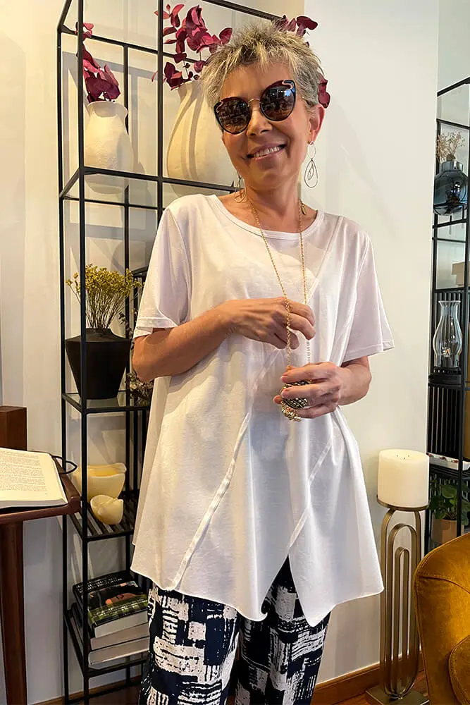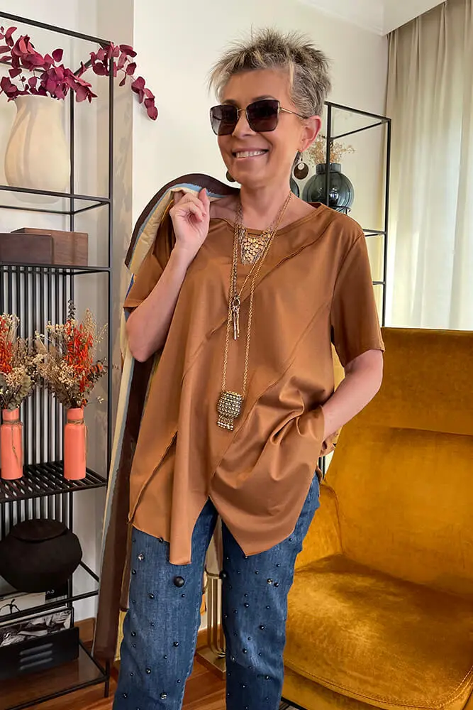 Top de modal con detalle de costuras a vista. Abertura en la parte delantera. Manga corta. Escote redondeado.