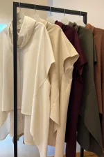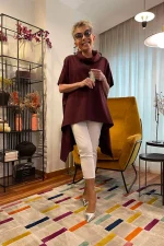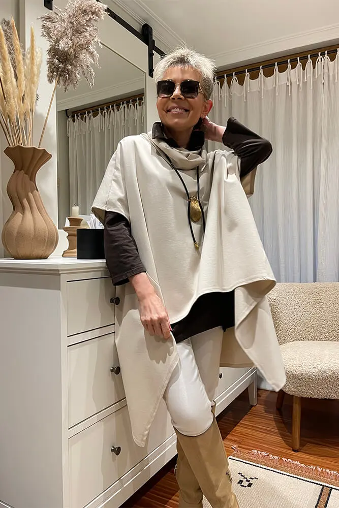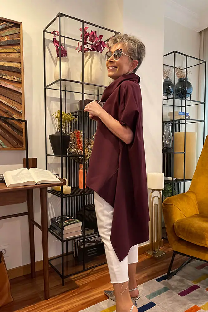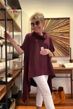Top tipo poncho de bajo asimétrico con picos en los laterales. Cuello subido y manga corta.
